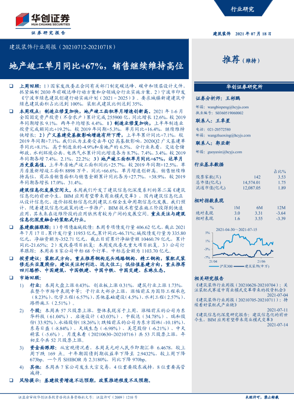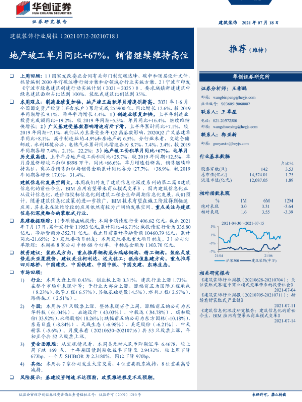 【华创证券】【20210718】建筑装饰行业周报:地产竣工单月同比+67%,销售继续维持高位-20页