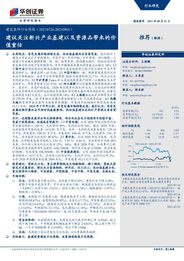 【华创证券】【20210801】建筑装饰行业周报:建议关注新兴产业基建以及资源品带来的价值重估-22页