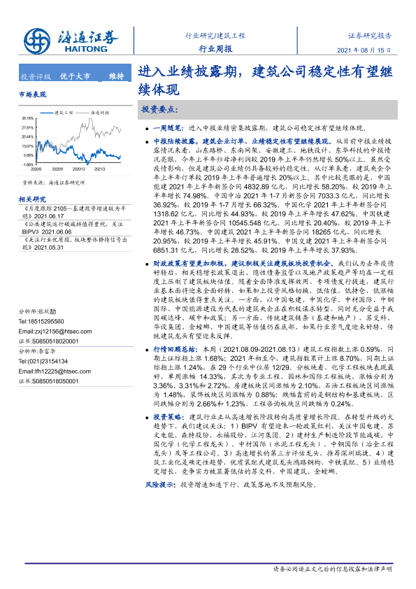 【海通证券】【20210815】建筑工程行业周报:进入业绩披露期,建筑公司稳定性有望继续体现-6页