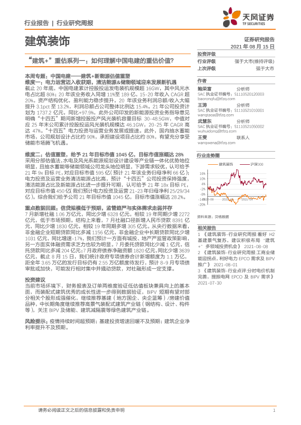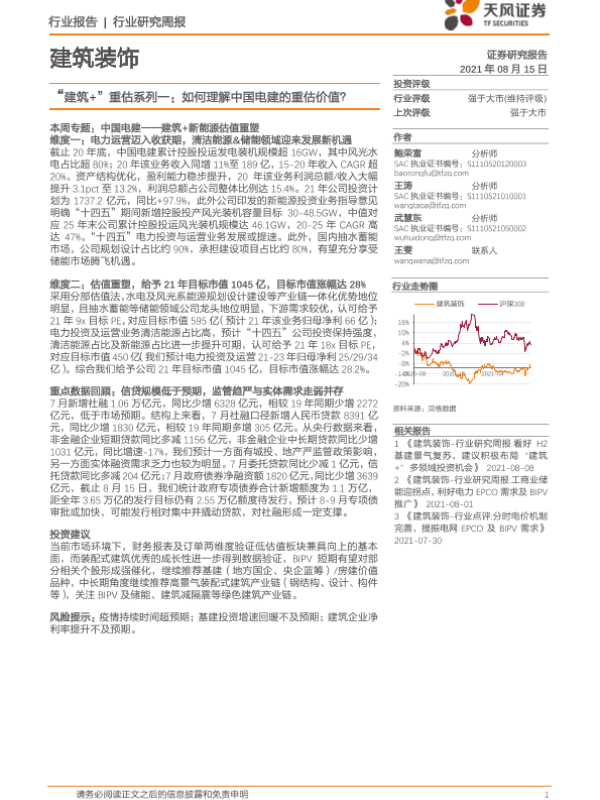【天风证券】【20210815】建筑装饰行业研究周报:“建筑+”重估系列一:如何理解中国电建的重估价值?-11页