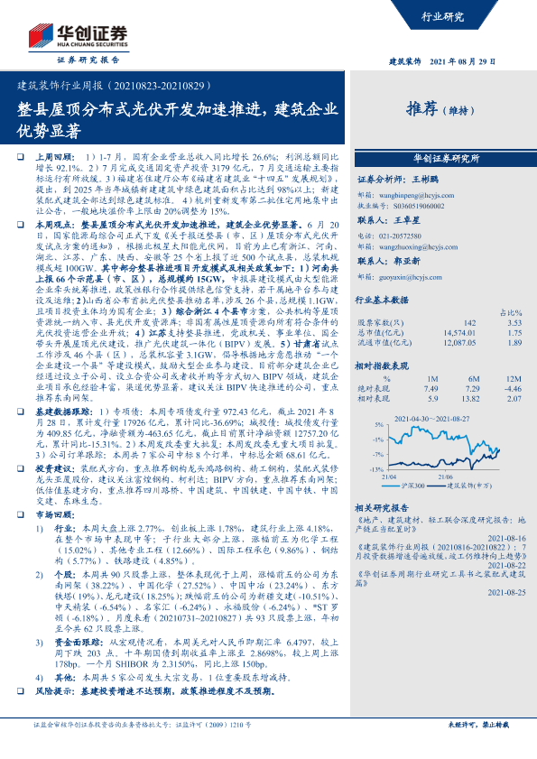【华创证券】【20210829】建筑装饰行业周报:整县屋顶分布式光伏开发加速推进,建筑企业优势显著-22页