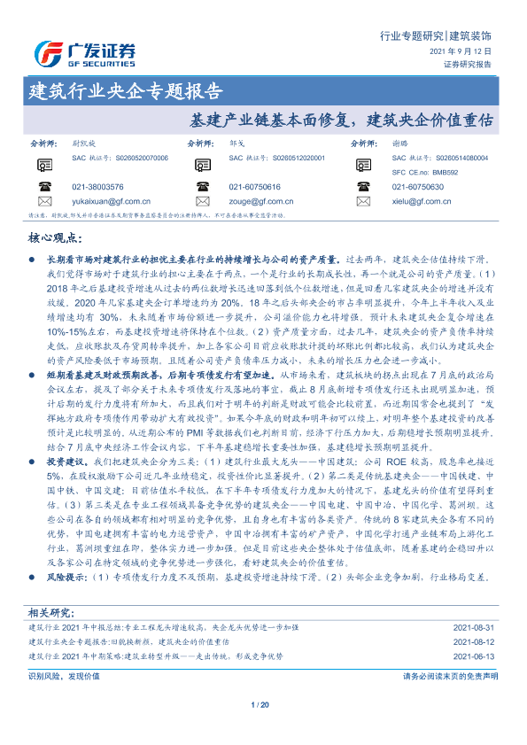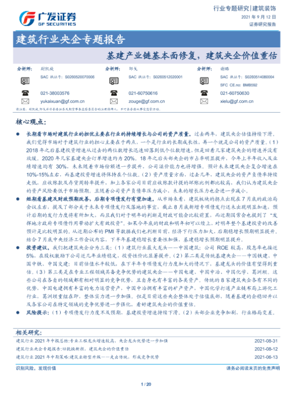 【广发证券】【20210912】建筑行业央企专题报告:基建产业链基本面修复,建筑央企价值重估-20页