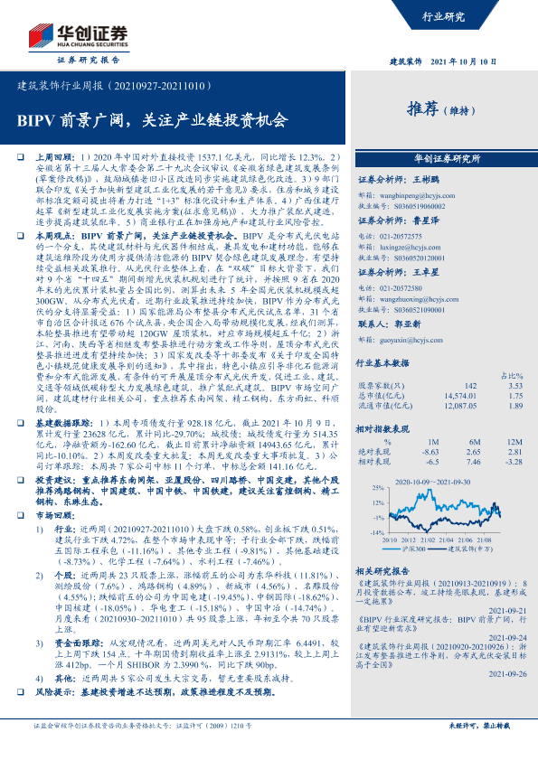 【华创证券】【20211010】建筑装饰行业周报:BIPV前景广阔,关注产业链投资机会-15页