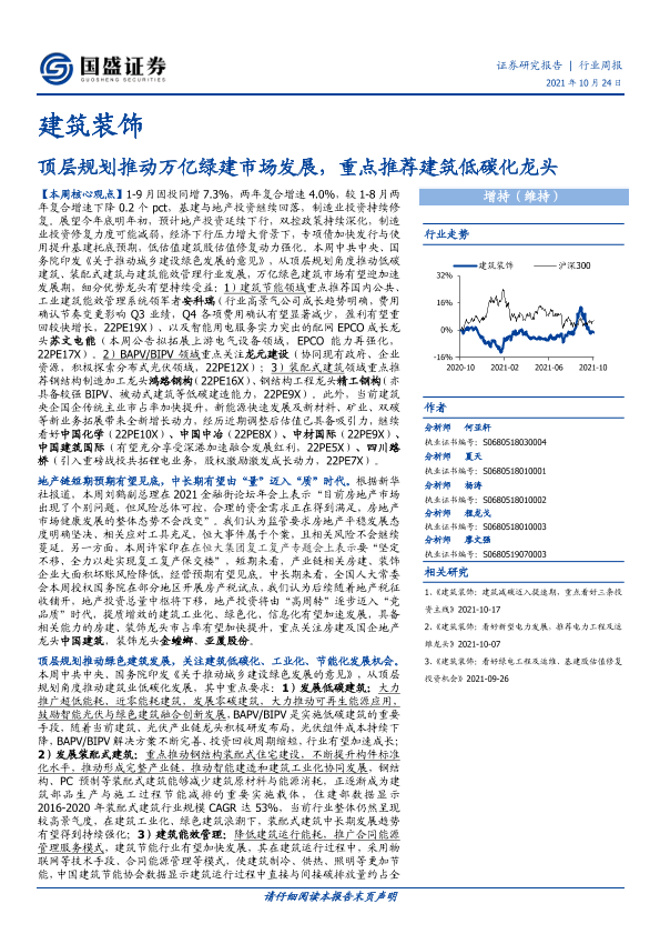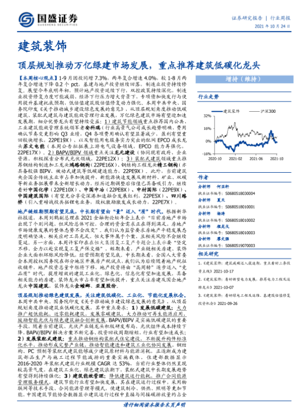 【国盛证券】【20211024】建筑装饰行业周报:顶层规划推动万亿绿建市场发展,重点推荐建筑低碳化龙头-15页