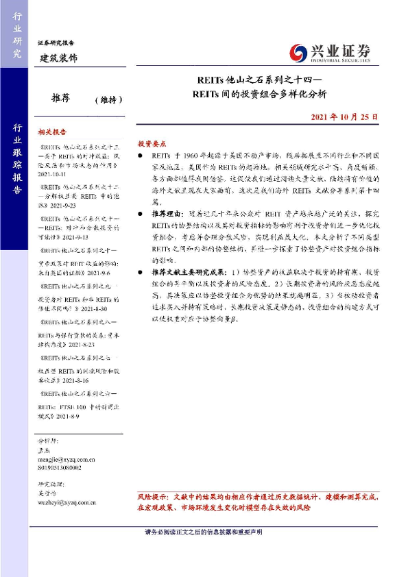 【兴业证券】【20211025】建筑装饰:REITs他山之石系列之十四-REITs间的投资组合多样化分析-17页