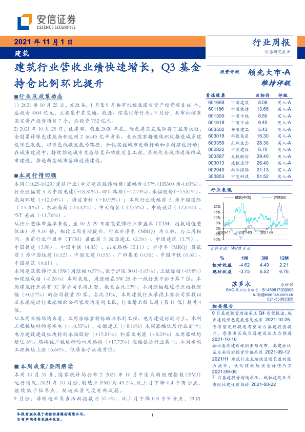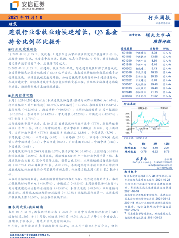 【安信证券】【20211101】建筑行业周报:建筑行业营收业绩快速增长,Q3基金持仓比例环比提升-13页