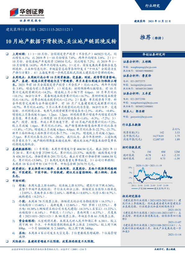 【华创证券】【20211122】建筑装饰行业周报:10月地产数据下滑较快,关注地产链困境反转-17页