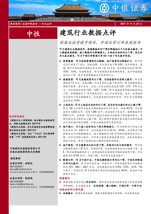 【中银证券】【20211122】建筑行业数据点评:制造业投资稳步增长,中国化学订单表现优异-7页