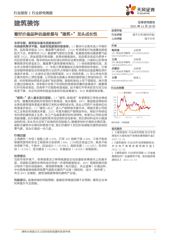 【天风证券】【20211128】建筑装饰行业研究周报:看好价值品种估值修复与“建筑+”龙头成长性-6页
