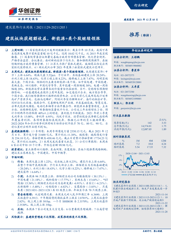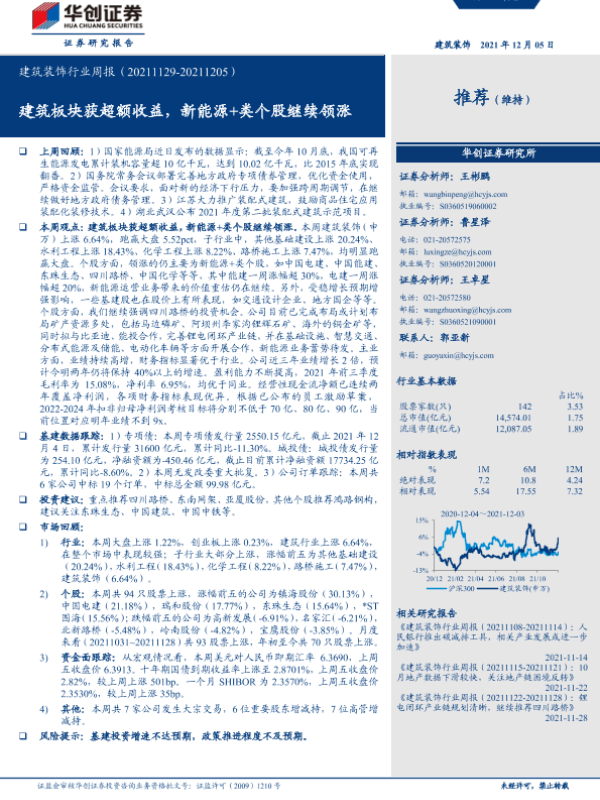 【华创证券】【20211205】建筑装饰行业周报:建筑板块获超额收益,新能源+类个股继续领涨-18页