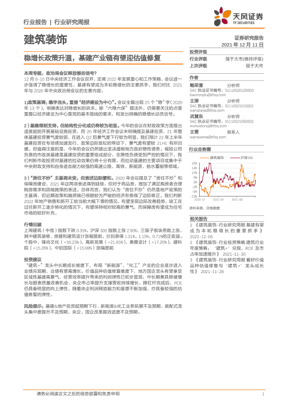 【天风证券】【20211211】建筑装饰行业研究周报:稳增长政策升温,基建产业链有望迎估值修复-8页