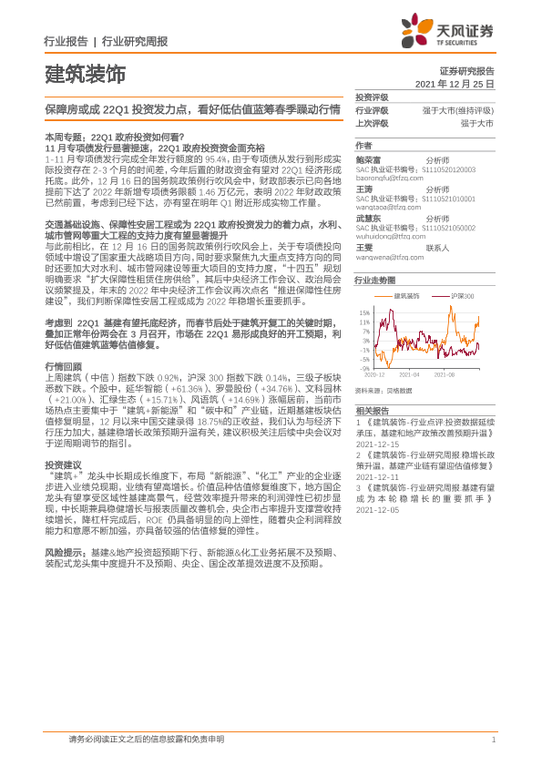 【天风证券】【20211225】建筑装饰行业研究周报:保障房或成22Q1投资发力点,看好低估值蓝筹春季躁动行情-7页