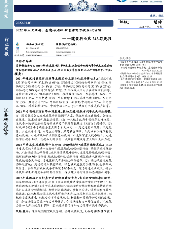 【国泰君安证券】【20220103】2022年五大机会:基建/碳达峰/新能源电力/央企/元宇宙-8页