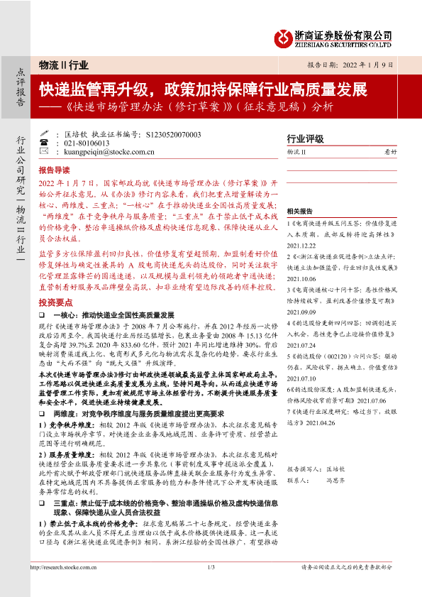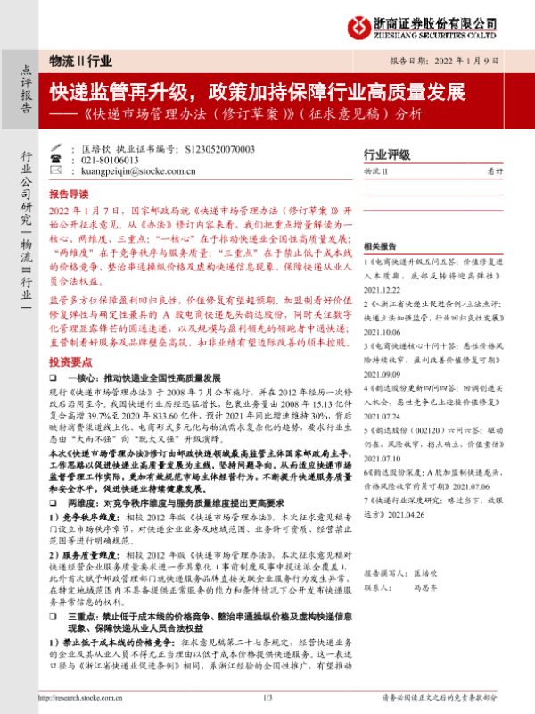 【浙商证券】【20220109】快递市场管理办法(修订草案)分析:快递监管再升级,政策加持保障行业高质量发展-3页