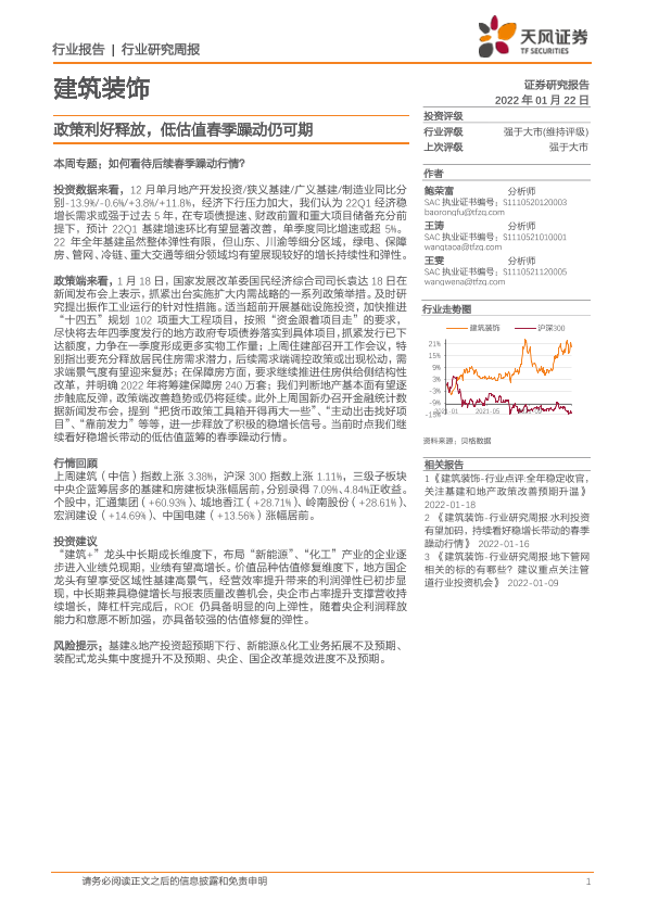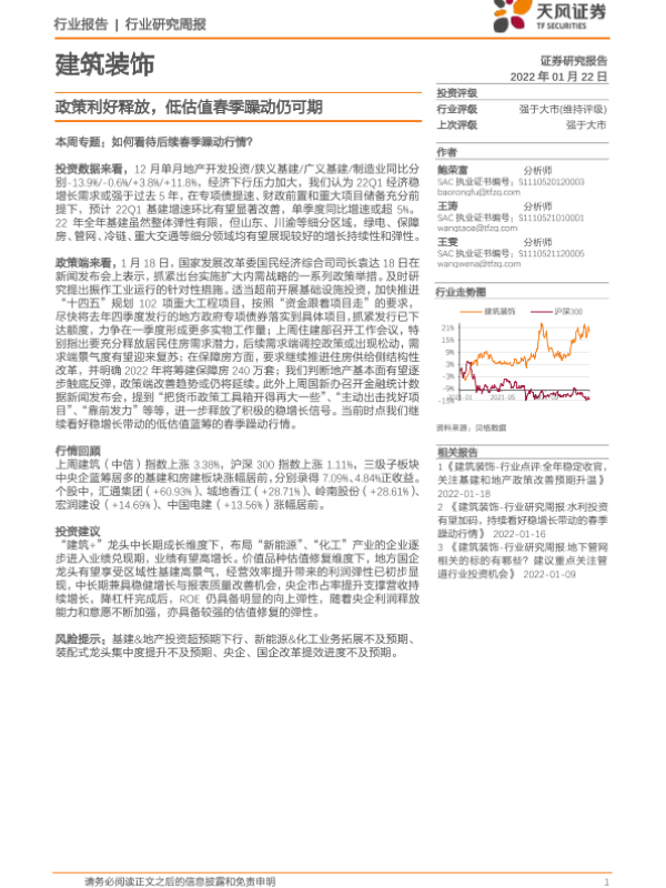 【天风证券】【20220122】建筑装饰行业研究周报:政策利好释放,低估值春季躁动仍可期-8页