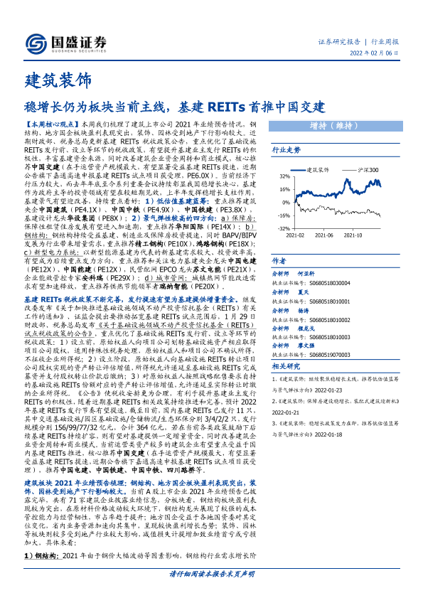 【国盛证券】【20220206】建筑装饰行业周报:稳增长仍为板块当前主线,基建REITs首推中国交建-14页