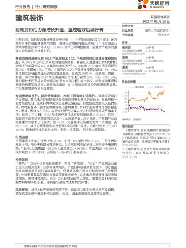 【天风证券】【20220213】建筑装饰行业研究周报:财政货币助力稳增长升温,坚定看好后续行情-8页