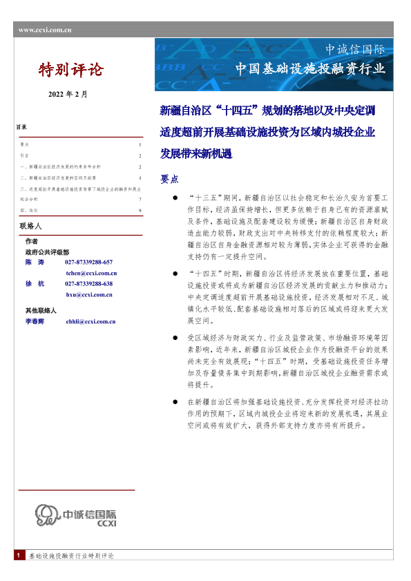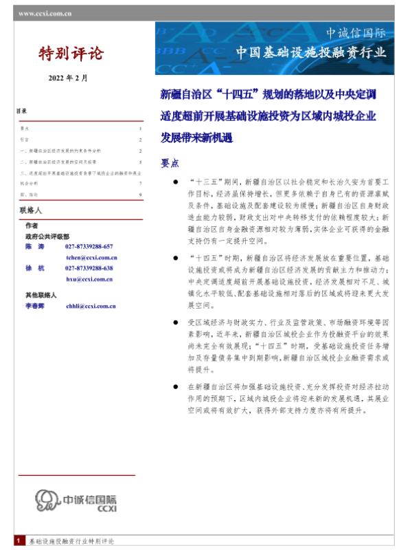 【中诚信国际】【202202】中国基础设施投融资行业:新疆自治区‘十四五’规划的落地及适度超前基础设施投资带来的城投企业发展机遇-10页