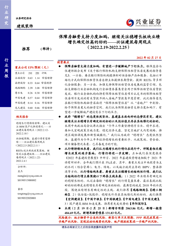 【兴业证券】【20220227】保障房融资支持力度加码,继续关注稳增长板块业绩增长确定性高的标的-42页