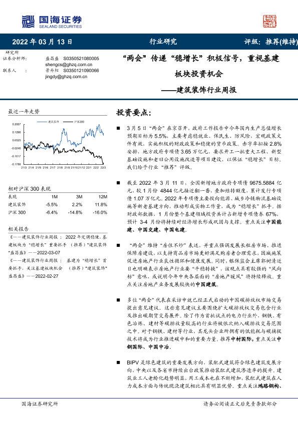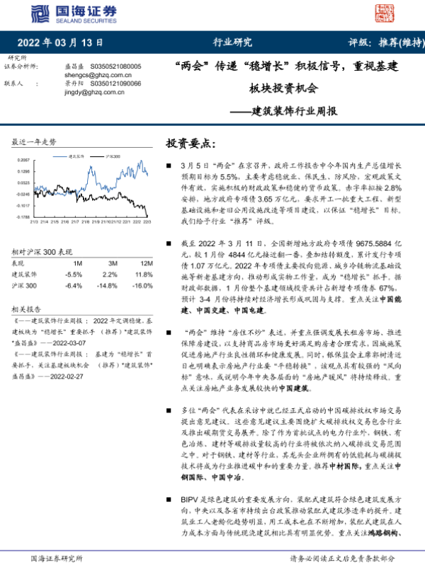 【国海证券】【20220313】建筑装饰行业周报:“两会”传递“稳增长”积极信号,重视基建板块投资机会-13页