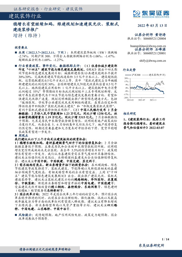 【东吴证券】【20220313】建筑装饰行业:稳增长有望继续加码,绿建规划加速建筑光伏、装配式建造装修推广-14页