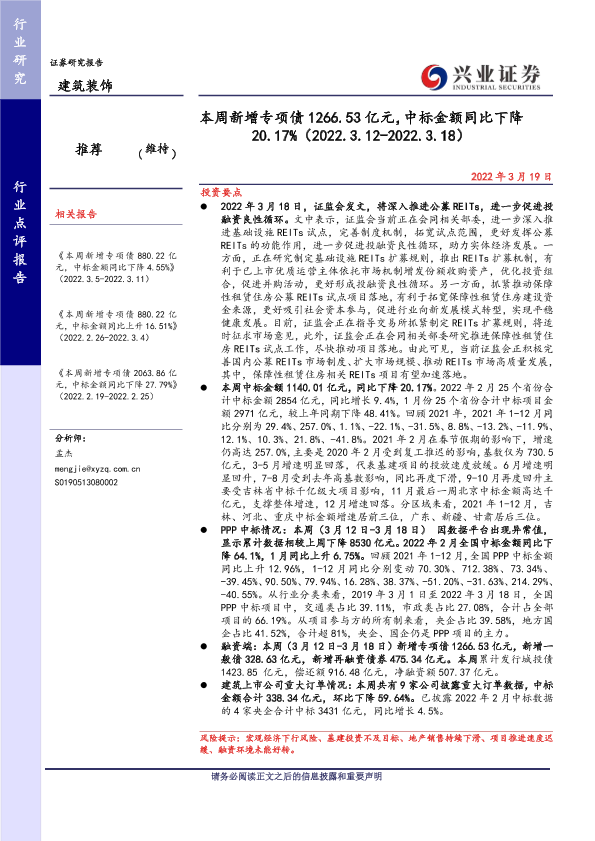 REITs REITS 专项债 中标金额 建筑装饰