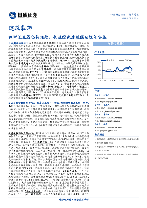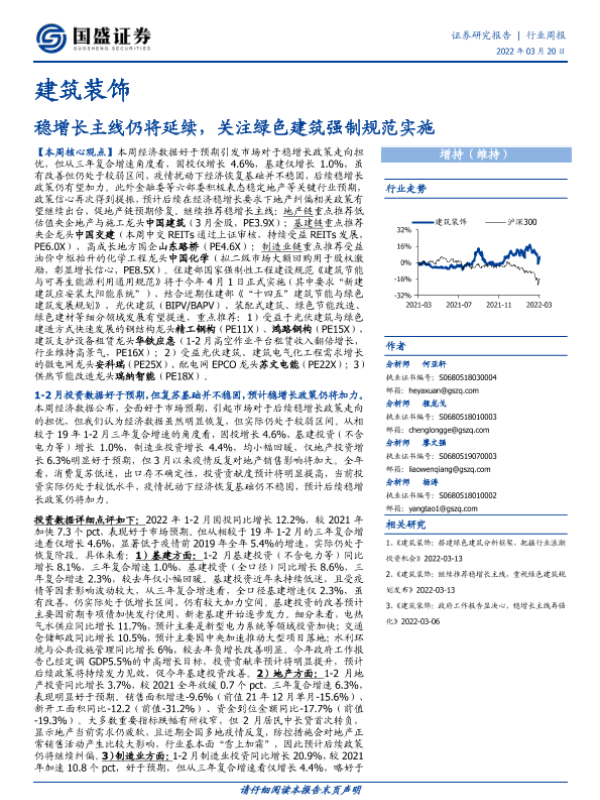 【国盛证券】【20220320】建筑装饰行业周报:稳增长主线仍将延续,关注绿色建筑强制规范实施-12页