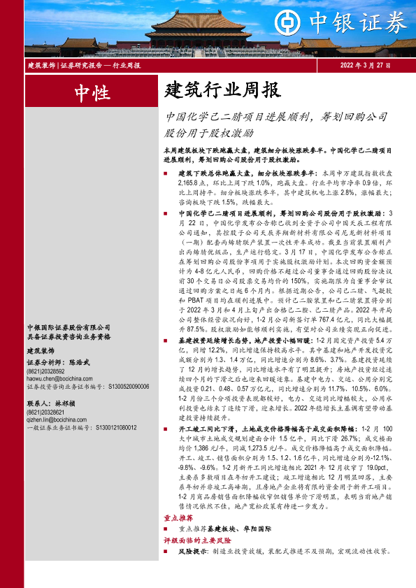 【中银证券】【20220327】建筑行业周报:中国化学己二腈项目进展顺利,筹划回购公司股份用于股权激励-16页