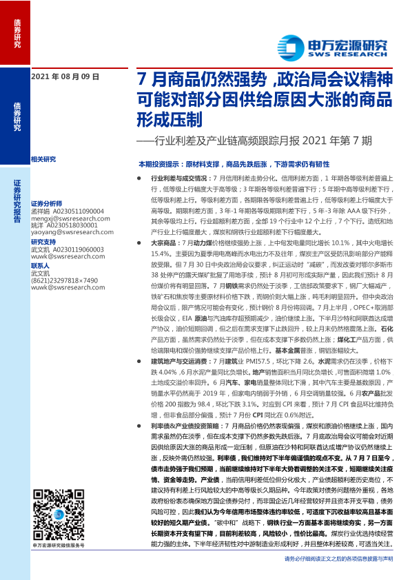 【申万宏源】【20210809】行业利差及产业链高频跟踪月报2021年第7期:7月商品仍然强势,政治局会议精神可能对部分因供给原因大涨的商品形成压制-25页