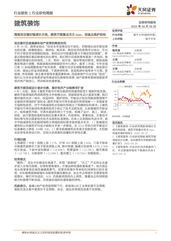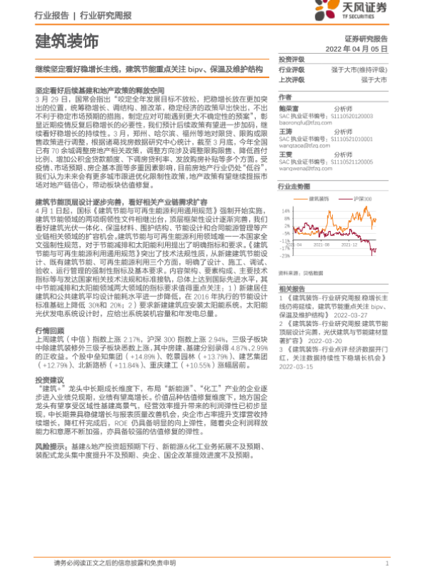 【天风证券】【20220405】建筑装饰行业研究周报:继续坚定看好稳增长主线,建筑节能重点关注bipv、保温及维护结构-7页