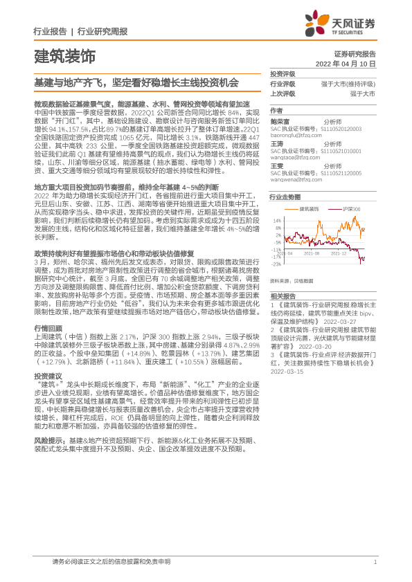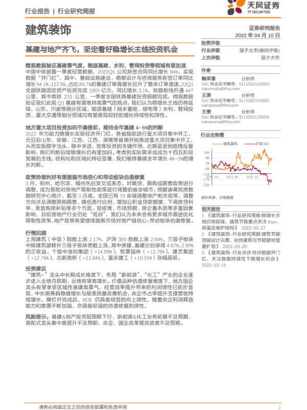 【天风证券】【20220410】建筑装饰行业研究周报:基建与地产齐飞,坚定看好稳增长主线投资机会-7页