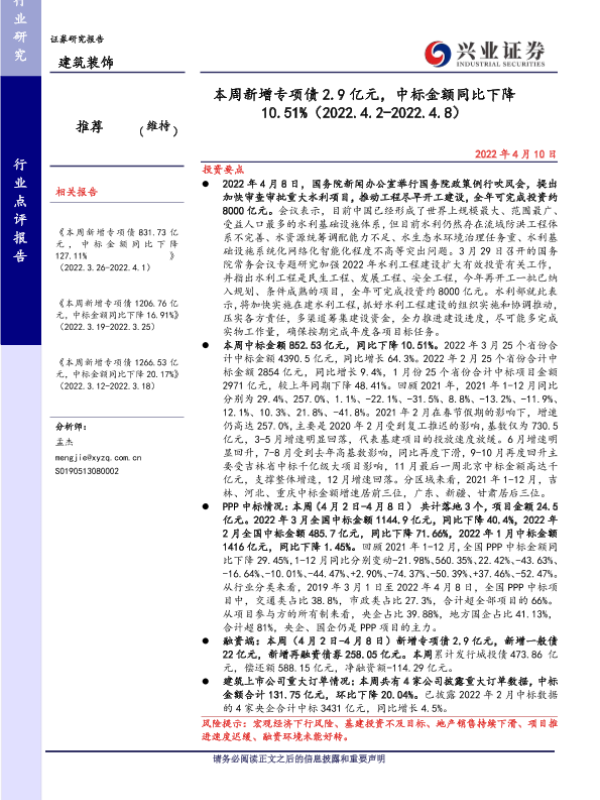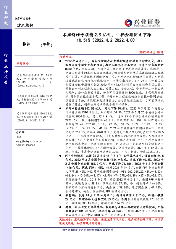 【兴业证券】【20220410】本周新增专项债2.9亿元,中标金额同比下降10.51%-33页