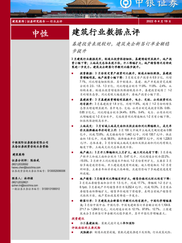 【中银证券】【20220419】建筑行业数据点评:基建投资表现较好,建筑央企新签订单金额稳步提升-7页