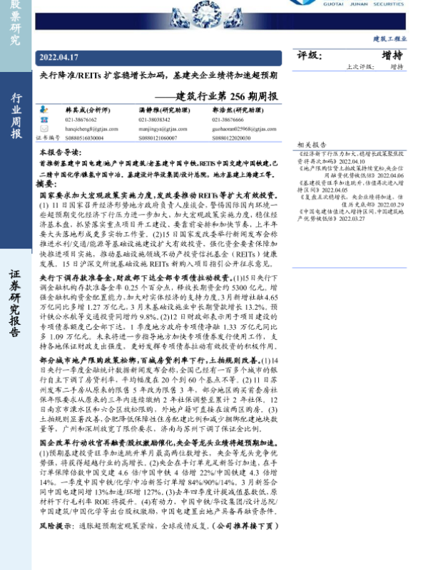 【国泰君安证券】【20220417】建筑行业第256期周报:央行降准 REITs扩容稳增长加码,基建央企业绩将加速超预期-22页