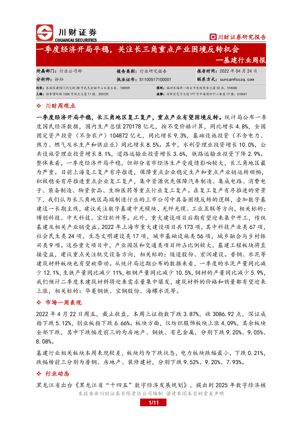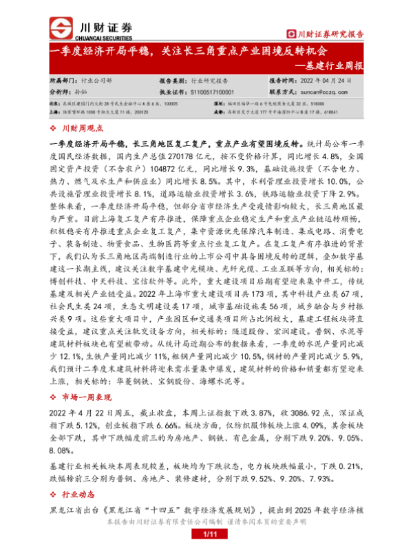 【川财证券】【20220424】基建行业周报:一季度经济开局平稳,关注长三角重点产业困境反转机会-11页