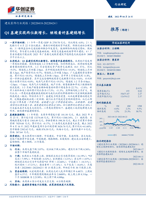 【华创证券】【20220424】建筑装饰行业周报:Q1基建实现两位数增长,继续看好基建稳增长-21页