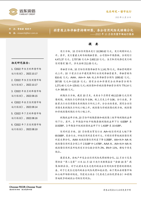 【远东资信】【20221116】2022年10月信用债市场运行报告:弱资质主体净融资持续回落,房企信用风险或继续分化-19页