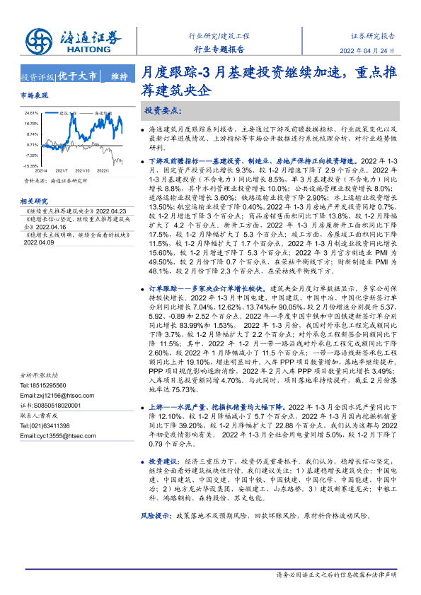 【海通证券】【20220424】建筑工程月度跟踪:3月基建投资继续加速,重点推荐建筑央企-16页