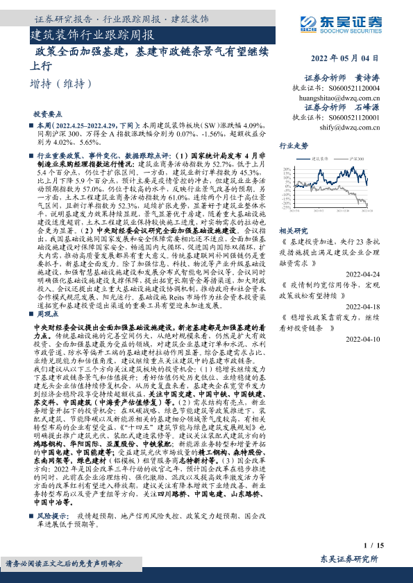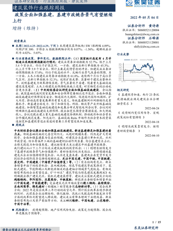 【东吴证券】【20220504】建筑装饰行业跟踪周报:政策全面加强基建,基建市政链条景气有望继续上行-15页