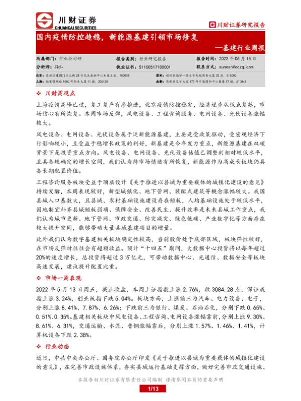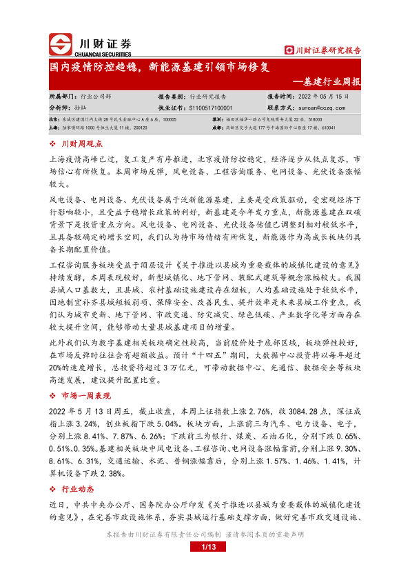 【川财证券】【20220515】基建行业周报:国内疫情防控趋稳,新能源基建引领市场修复-13页