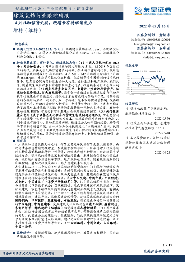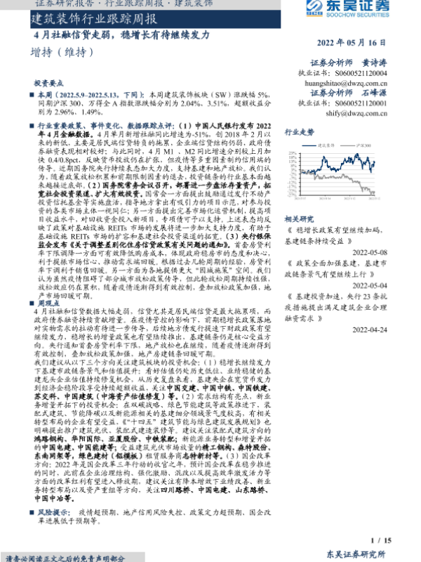 【东吴证券】【20220515】建筑装饰行业跟踪周报:4月社融信贷走弱,稳增长有待继续发力-15页