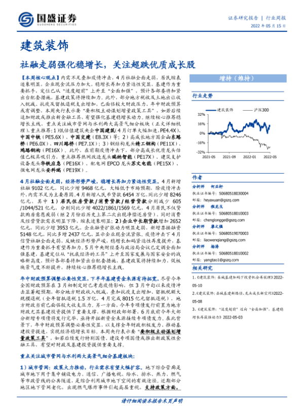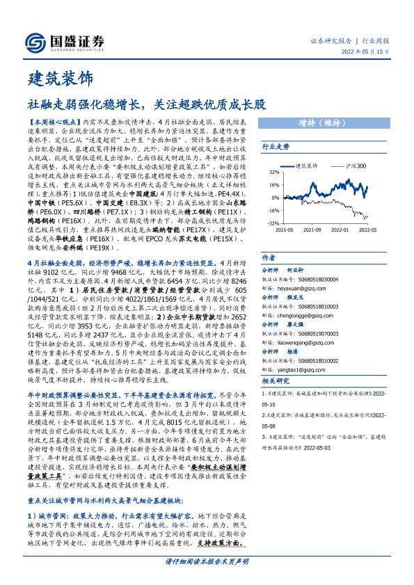 【国盛证券】【20220515】建筑装饰行业周报:社融走弱强化稳增长,关注超跌优质成长股-14页