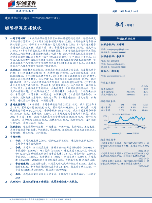 【华创证券】【20220516】建筑装饰行业周报:继续推荐基建板块-16页
