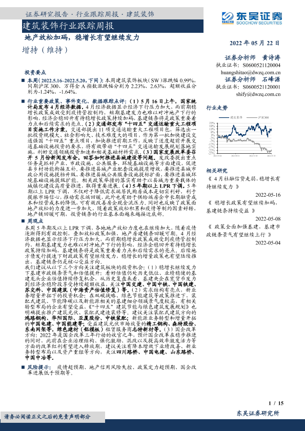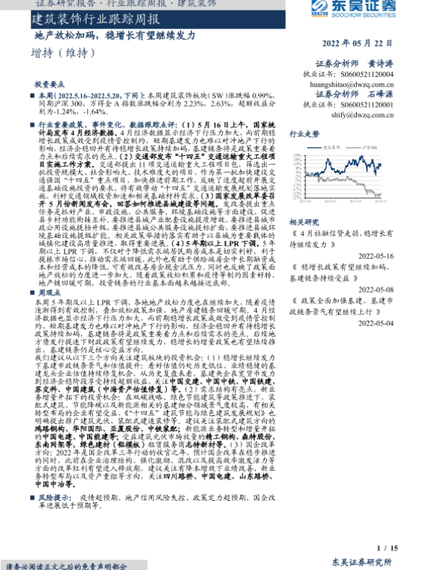 【东吴证券】【20220522】建筑装饰行业跟踪周报:地产放松加码,稳增长有望继续发力-15页