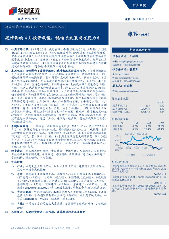 【华创证券】【20220522】建筑装饰行业周报:疫情影响4月投资放缓,稳增长政策尚在发力中-16页