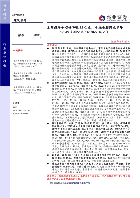 【兴业证券】【20220522】本周新增专项债795.32亿元,中标金额同比下降17.4%-39页