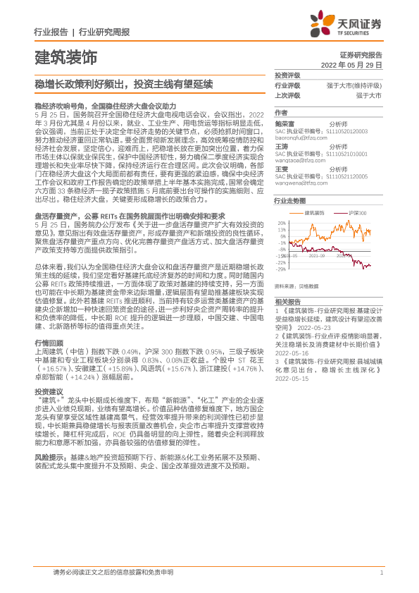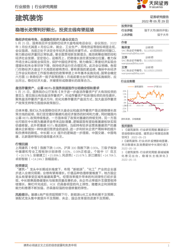 【天风证券】【20220529】建筑装饰行业研究周报:稳增长政策利好频出,投资主线有望延续-7页