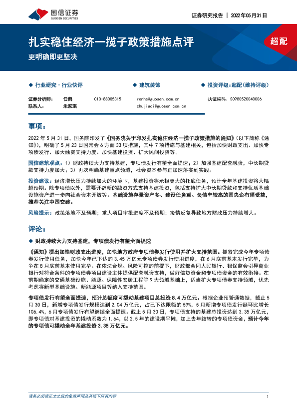 专项债发行 基建投资 建筑装饰 政策措施 经济稳定