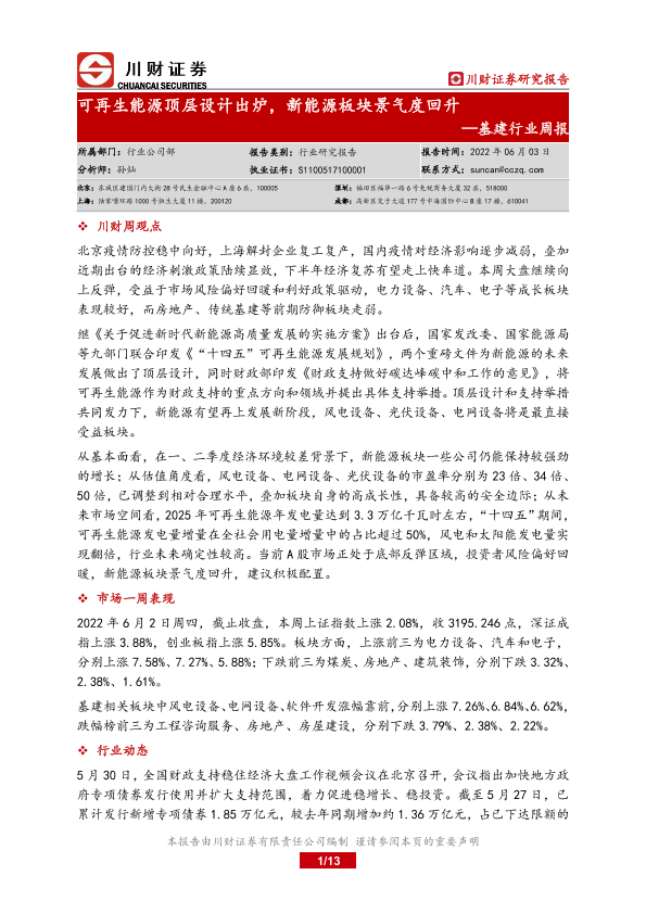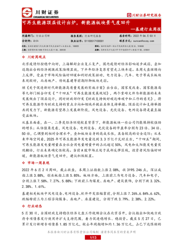 【川财证券】【20220603】基建行业周报:可再生能源顶层设计出炉,新能源板块景气度回升-13页