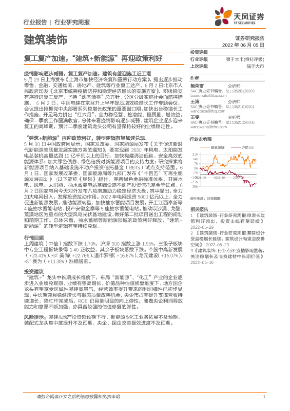 【天风证券】【20220605】建筑装饰行业研究周报:复工复产加速,“建筑+新能源”再迎政策利好-7页